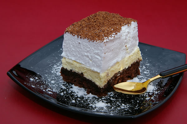 Vis Vienez (100 gr) - Cremă lejeră de vanilie, foi de bezea cu alune, în straturi, totul pudrat cu zahăr fin şi dulce.