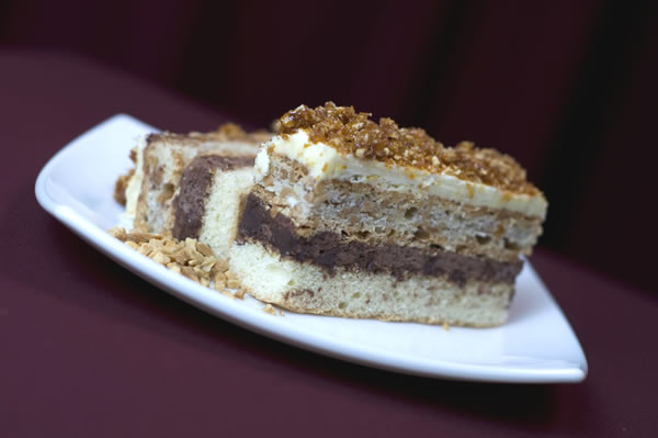 Felii tort cu nucă (150 gr) - Cremă de ness cu rom între straturi de pandişpan alb cu nucă, bogat însiropat, glazurate cu zahăr ars şi nuci sfărâmate.
